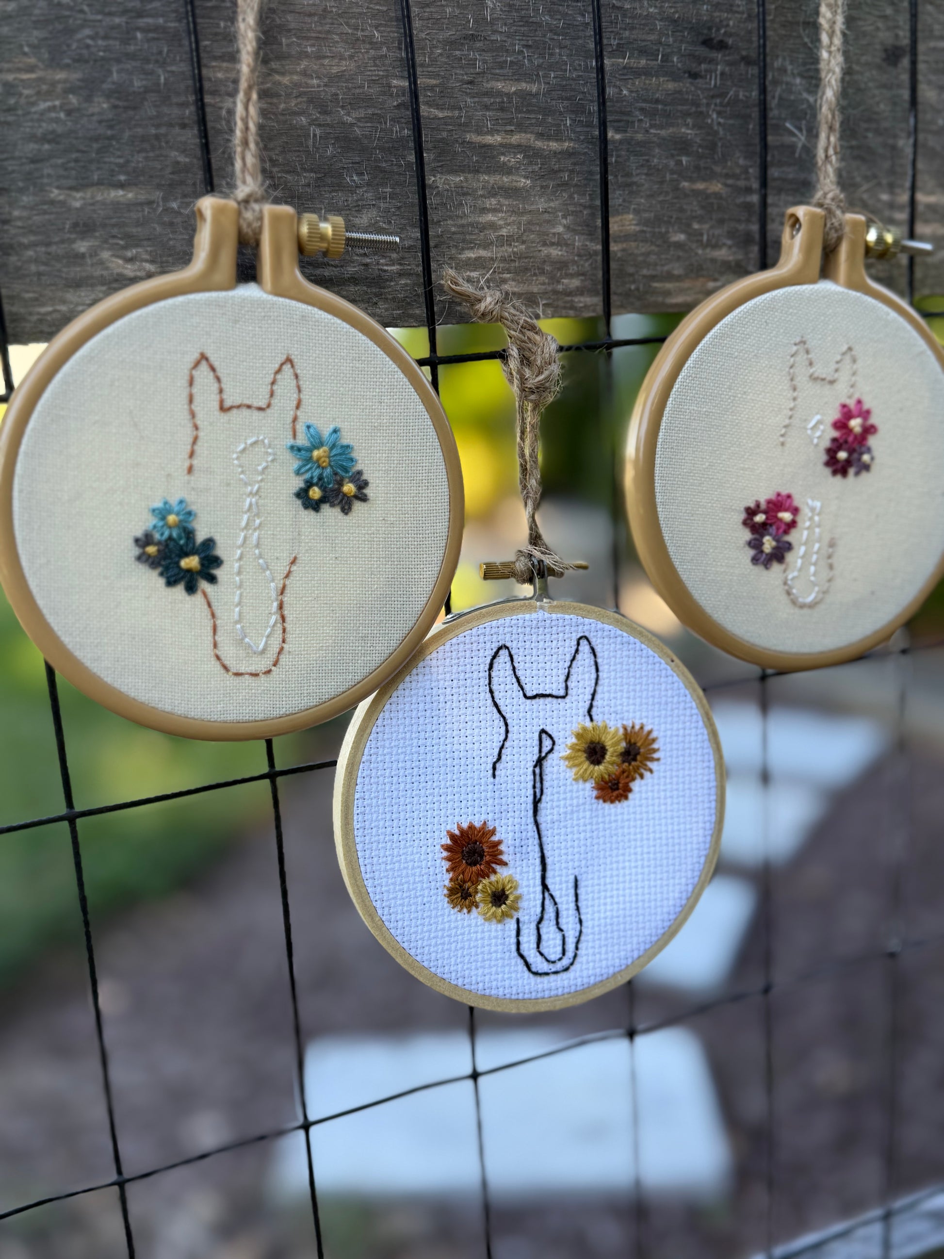 Each design is carefully cross stitched and framed in a wooden or plastic hoop, ready to hang or gift. Perfect as a unique wall hanging, ornament, or thoughtful gift for the horse lover in your life.